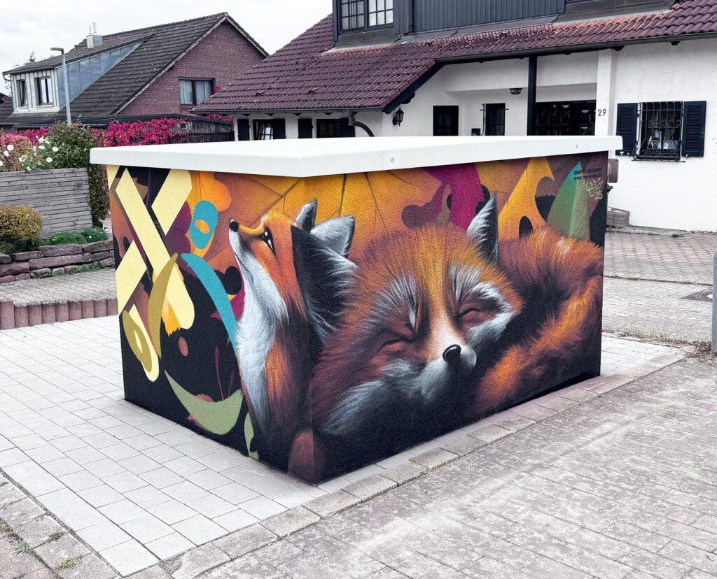 Mitten zwischen die Häuser im Fuchsweg gab es dieses herbstliche Motiv – natürlich mit Füchsen, die sich hier zufrieden, entspannt und glücklich zur Ruhe legen! Wie immer : all spraypainted!